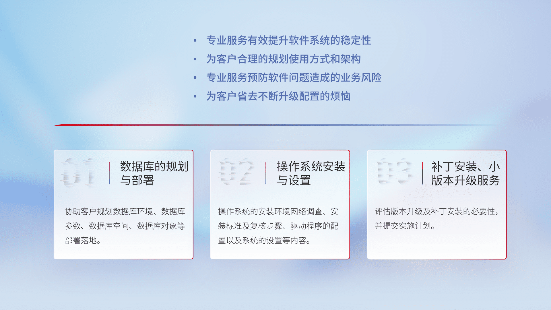 为客户提供软件规模升级、、、快速部署、、按需配置的专业服务,,,从数据库的规划与部署到操作系统的安装与设置,,,,再到补丁安装和小版本升级提供支持。。。。